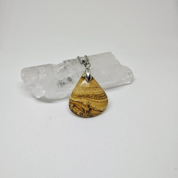 Colgante en forma de gota de Jaspe Madera. Incluye cadena de acero quirúrgico de 50cm. El dije mide 3 cm de largo y 2,5 cm de ancho.